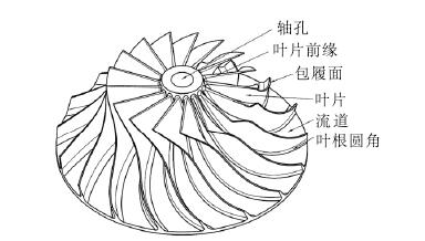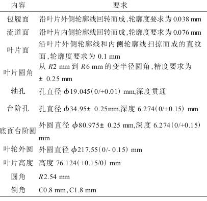 本文所研究整體葉輪零件圖樣如圖1所示,該葉輪為半開放式整體葉輪,葉片數(shù)量為17,是某離心式空氣壓縮機(jī)的核心零件,葉輪三維結(jié)構(gòu)如圖2所示。該葉輪結(jié)構(gòu)比較復(fù)雜,葉片扭曲程度比較高,主要有葉片、流道、圓角、孔等特征。葉輪的主要加工難點(diǎn)為葉片面、流道面和葉根圓角,此位置加工時(shí)容易產(chǎn)生干涉,并且只能采用小刀具加工,效率低,葉輪內(nèi)孔尺寸要求以及內(nèi)孔與葉輪外輪廓的同軸度要求都比較高,零件主要加工內(nèi)容如表1所示。