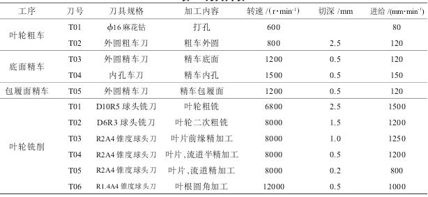 三爪夾盤夾持,完成葉輪底面臺(tái)階圓、臺(tái)階孔精車;第3次裝夾采用三爪夾盤和軟爪夾持,完成葉輪孔和輪轂的精車;第4次裝夾采用專用夾具夾持,完成葉輪銑削加工。工藝路線制定如下:1)備料。0Cr17Ni4Cu4Nb棒料,尺寸為220 mm×95 mm。2)打孔。在數(shù)控車床上用三爪夾盤夾持,打孔直徑為16 mm,深度貫通。3)粗車。粗車葉輪輪轂面,留2 mm精車余量。4)精車葉輪底面。在數(shù)控車床上零件掉頭,用三爪夾盤夾持,精車葉輪底面臺(tái)階外圓和臺(tái)階孔。5)精車葉輪包履面。在數(shù)控車床上用三爪夾盤和軟爪夾持。葉輪底面臺(tái)階外圓,精車內(nèi)孔和輪轂面。6)葉輪粗銑。在五軸聯(lián)動(dòng)加工中心上用專用夾具夾持,粗銑葉輪,流道方向和葉片方向各留0.5 mm精銑余量。7)粗銑葉片前緣。粗銑葉片前緣,留0.5mm精銑余量。8)葉片半精加工。半精加工葉片,葉片方向留0.2 mm精銑余量,流道方向留0.5 mm精銑余量。9)流道半精加工。半精加工流道,流道方向留0.2 mm精銑余量,葉片方向留0.5 mm精銑余量。10)葉片精加工。精加工葉片至零件圖樣要求。11)流道精加工。精加工流道至零件圖樣要求。12)葉根圓角精加工。精加工葉根圓角至零件圖樣要求。